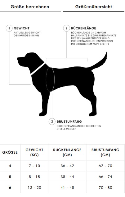 ** RÜCKENLÄNGE messen vom unteren Halsbandrand bis Rutenansatz (bei erhobenem Kopf des Hundes und locker getragenem Halsband).
